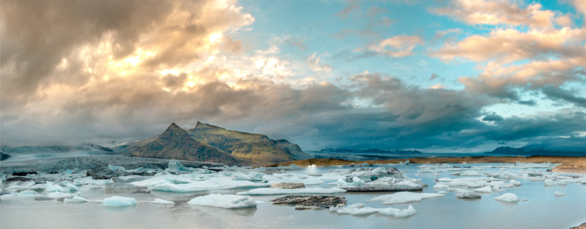 Icebergs drift through the Jökulsárlón Glacier Lagoon under a dramatic sunset sky in Vatnajökull National Park, Iceland.