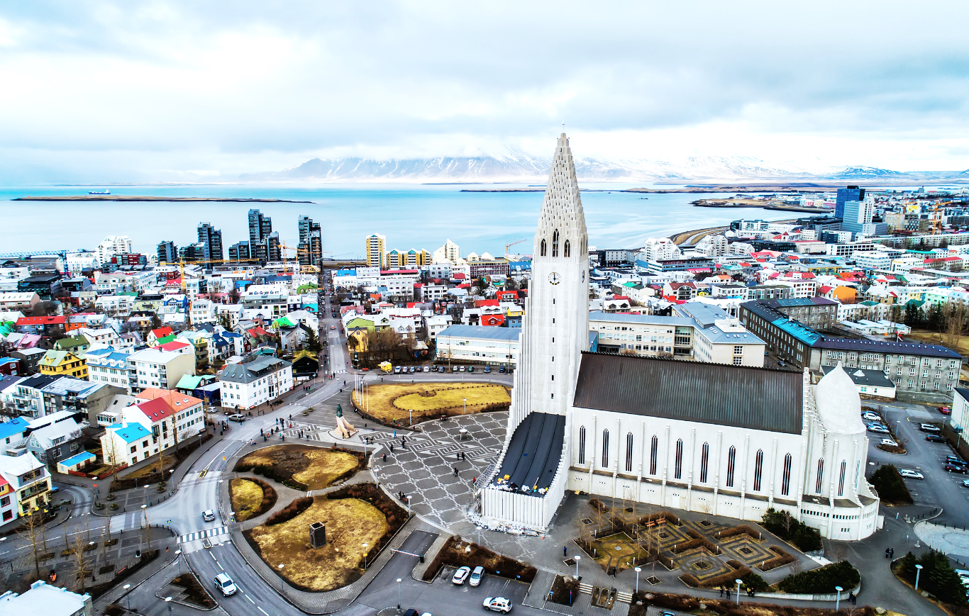 A bird's-eye view of Iceland’s capital, featuring the basalt-inspired architecture of its most famous church.