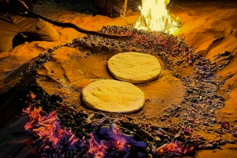 The process is mesmerizing to watch. A fire is built on clean sand until it burns down to hot coals. The coals are swept aside, and the dough—a simple, dense mixture of flour, water, and salt—is placed directly onto the superheated sand. It is then covered with more hot sand and embers. The bread bakes inside this subterranean kiln, absorbing the dry, intense heat of the desert.